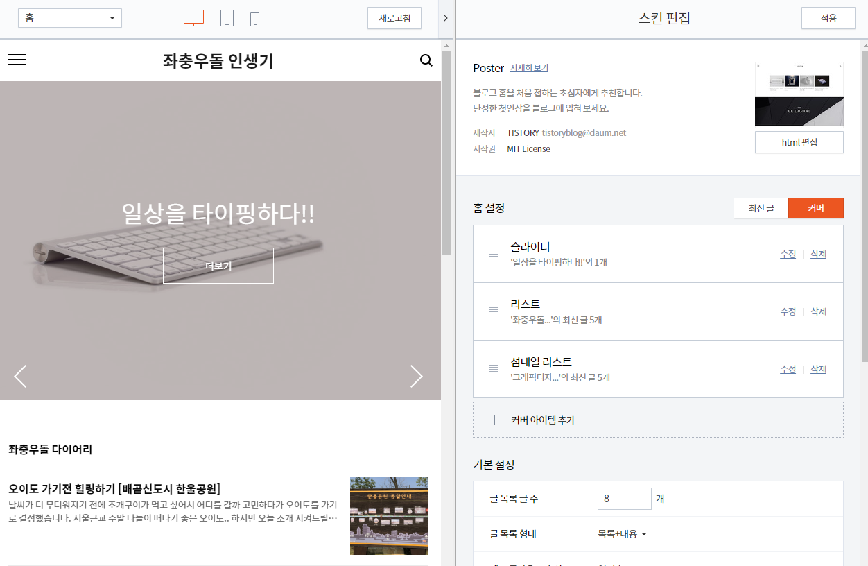 하지만 현재 티스토리 블로그 스킨은 기본적인 반응형 홈페이지의 모습을 보여줄 수 있으며, 워드프레스 보다도 더 손 쉽게 꾸밀 수 있습니다.