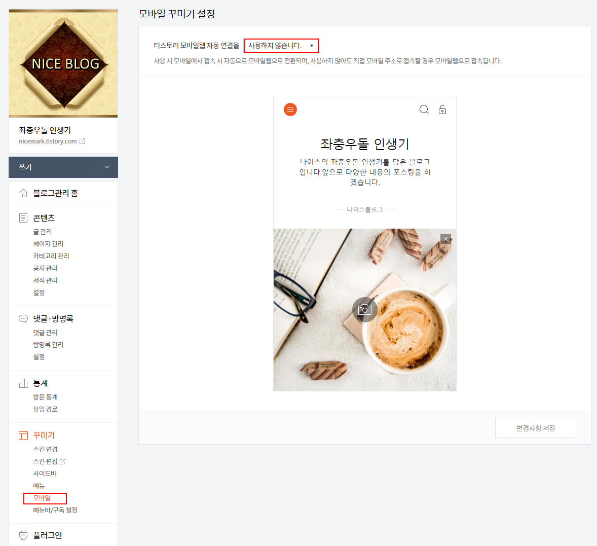 참고로 위와 같이 반응형 블로그로 하기 위해서는 "설정 > 꾸미기 > 모바일" 에서 모바일 꾸미기 설정을 "사용하지 않습니다"로 변경해 주셔야 스마트폰에서도 변경된 메인으로 확인 하실 수 있습니다.