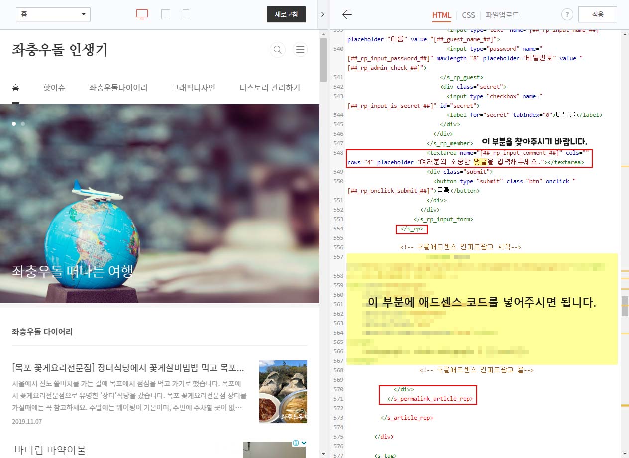 Step5. 위의 이미지를 참고하시고 "여러분의 소중한 댓글을 입력해주세요" 이 부분을 찾아서 </s_rp>와 </div>사이에 애드센스 코드를 넣어주시면 됩니다.