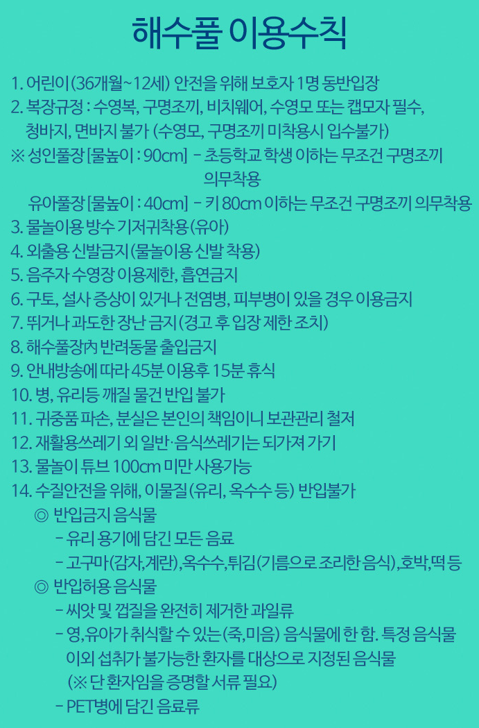 운영시간은 10시 ~17시까지며, 점심시간 12시~13시까지 있으며 점심시간에는 풀장 이용을 할 수 없습니다. 또한, 45분 운영 15분 휴식을 하며 날씨 및 기온에 따라 운영기간과 운영시간은 조정 될 수 있답니다.
