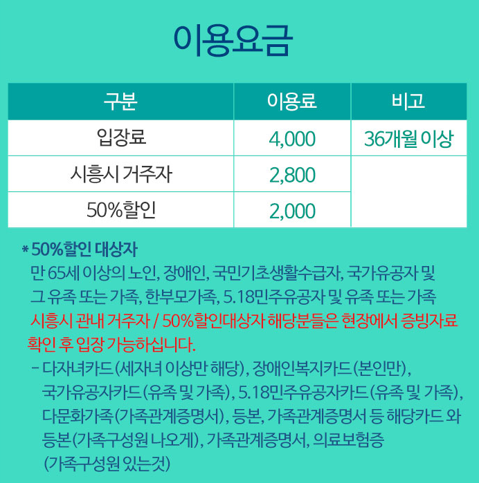 입장료는 36개월 이상 4천원이며, 시흥시 거주자는 30% 할인해서 2,800원에 이용이 가능하며, 인터파크에서 온라인 티켓을 판매하고 있으니 자세한 사항은 아래 링크에서 확인 부탁드립니다.