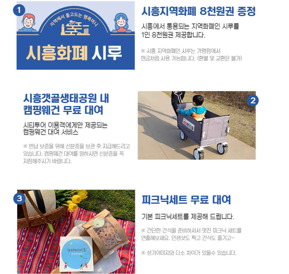 시흥 지역화폐인 '시루' 8천원권과 피크닉세트를 함께 제공합니다.