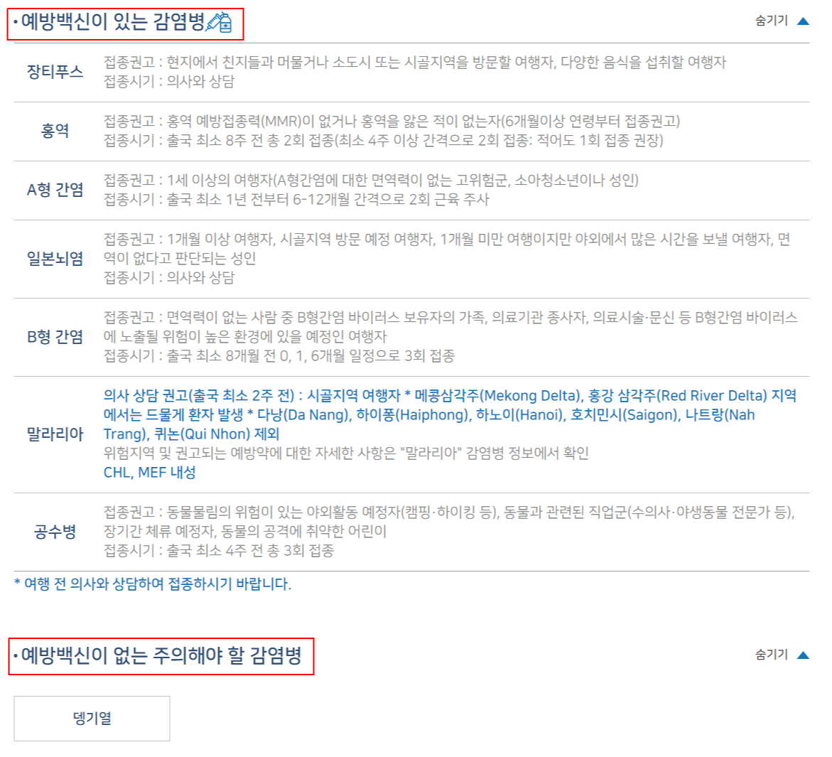 또한 예방백신이 있는 감염병과 예방백신이 없으므로 특히 주의해야 할 감염병을 확인할 수 있습니다.