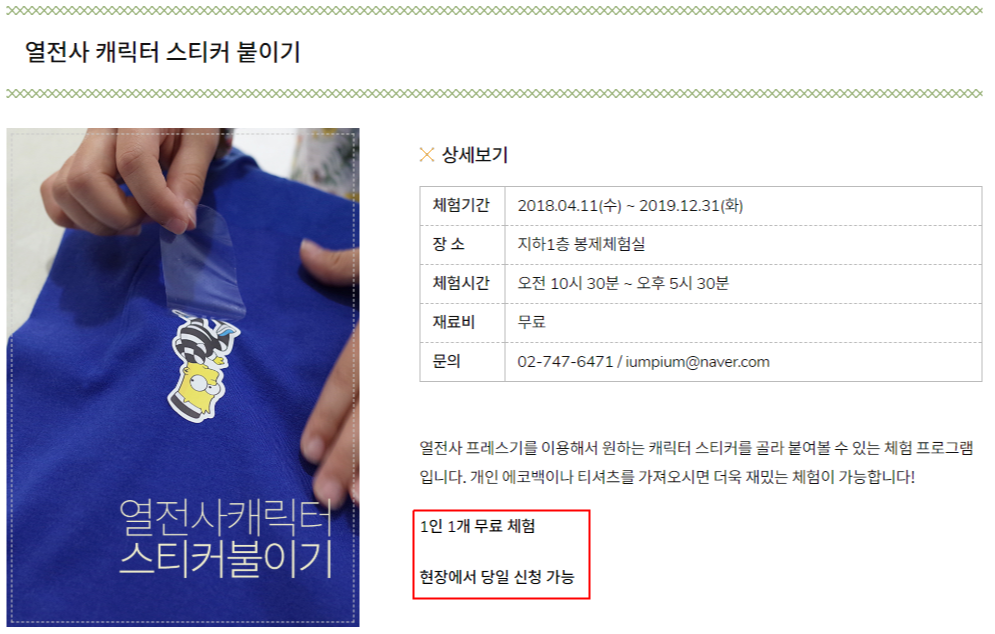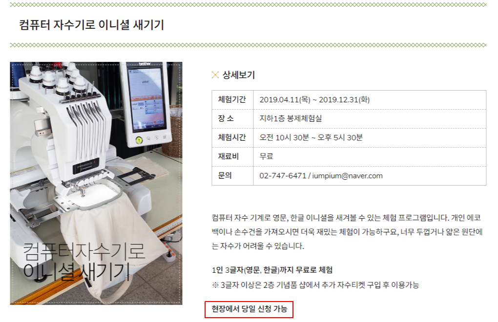 '열전사 캐릭터 스티커 붙이기' 및 '컴퓨터 자수기로 이니셜 새기기'는현장에서 바로 체험 할 수 있는 무료 프로그램 입니다.