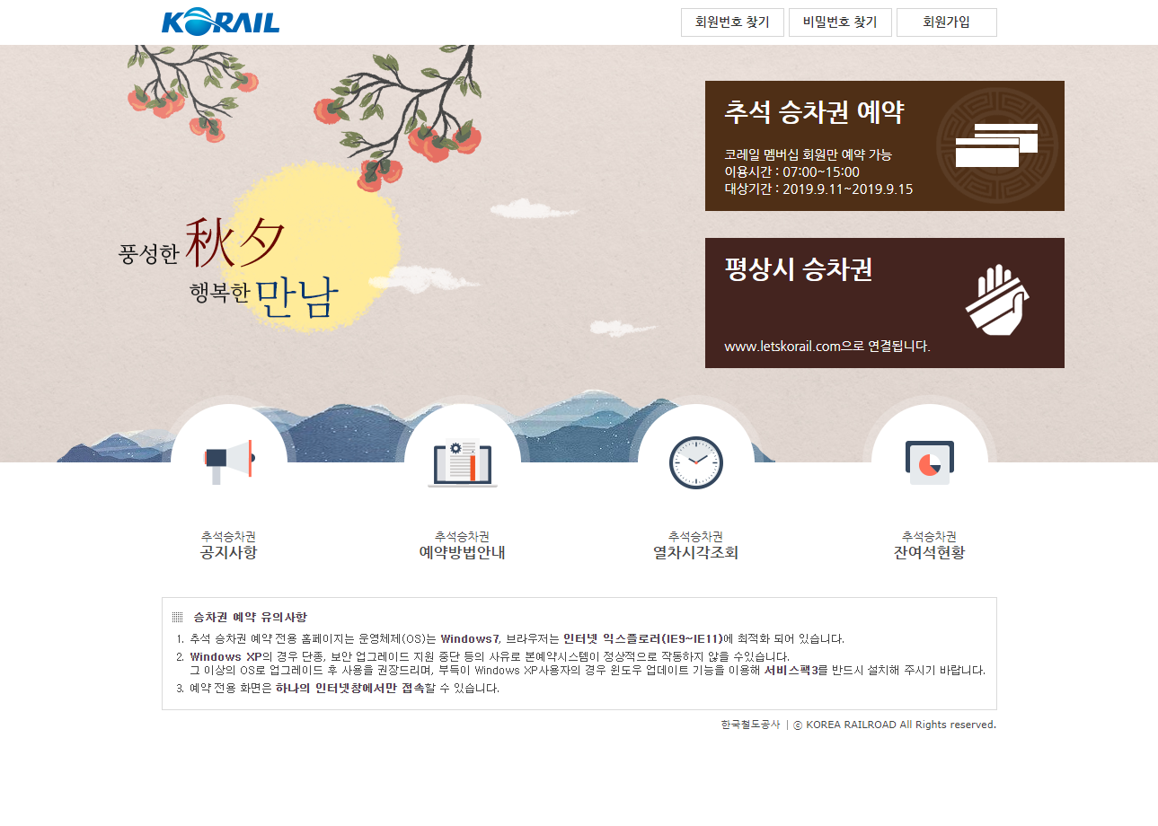 2019년 추석 기차표 예매가 20일부터 시작이 되었습니다.