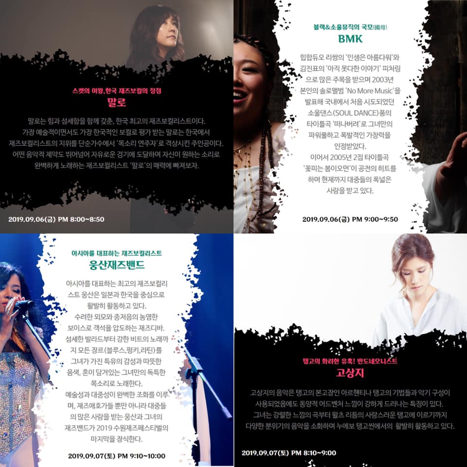 | 9. 6(금) 18:00~21:50 BMK 말로 SW재즈빅밴드 KT&G 상상유니브 밴드 9. 7(토) 17:00~22:00 웅산밴드 고상지 프렐류드 with 고아라 SW재즈빅밴드 KT&G 상상유니브 밴드 |