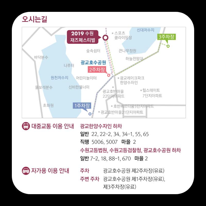 대한민국 최고경관으로 꼽힌 '광교호수공원'을 배경으로 국내외 재즈아티스트들이 모여 편안하고 감미로운 재즈음악으로 꾸미는 수원재즈페스티벌은 올해로 6회를 맞이합니다. 정통재즈부터 남녀노소 누구나 편안하게 즐길 수 있는 재즈까지, 무르익는 단풍만큼이나 감성도 깊어진 가을에 수원재즈페스티벌과 함께해 보세요.