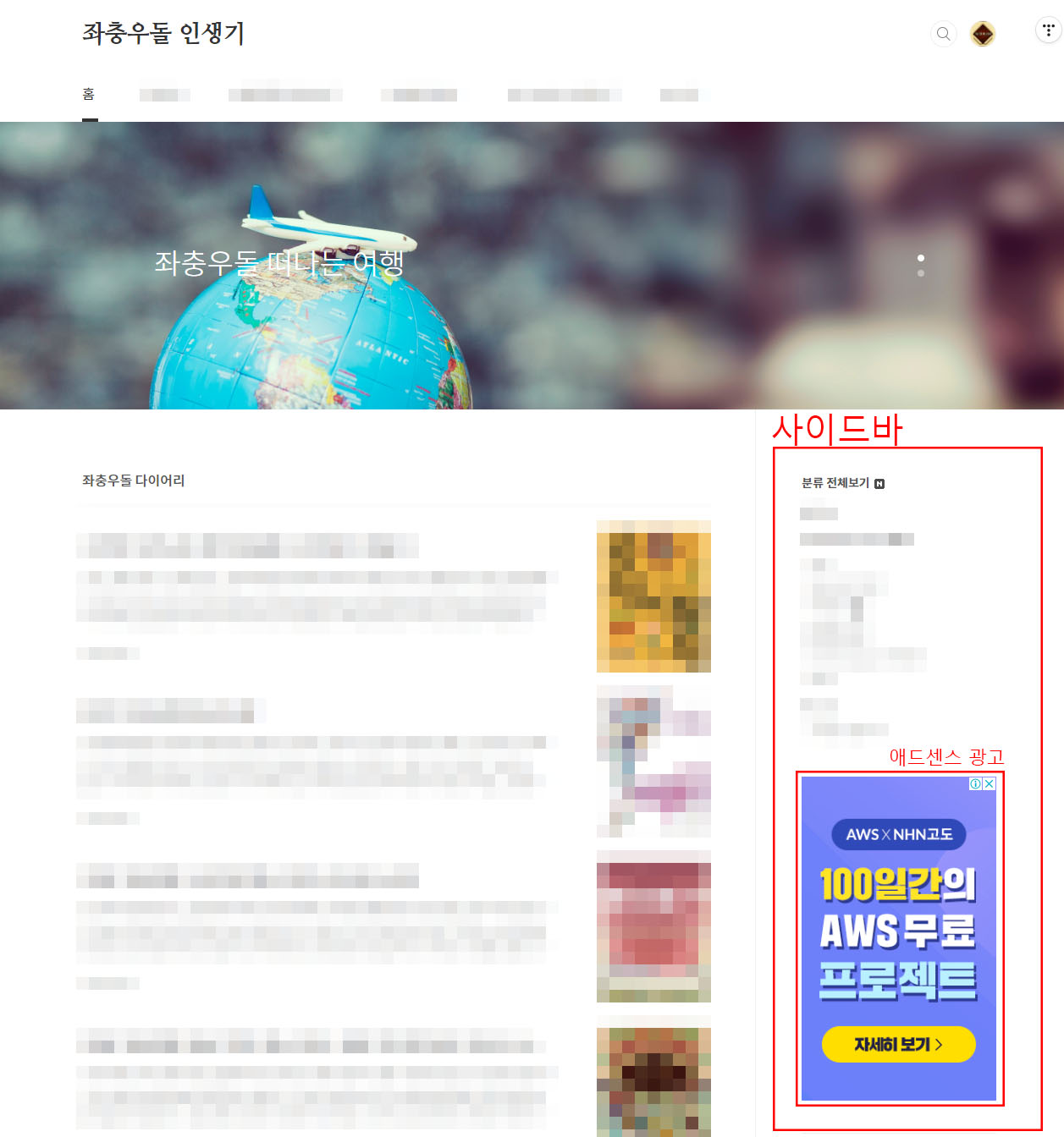 우측의 큰 박스가 애드센스 광고가 들어갈 사이드바 부분입니다.