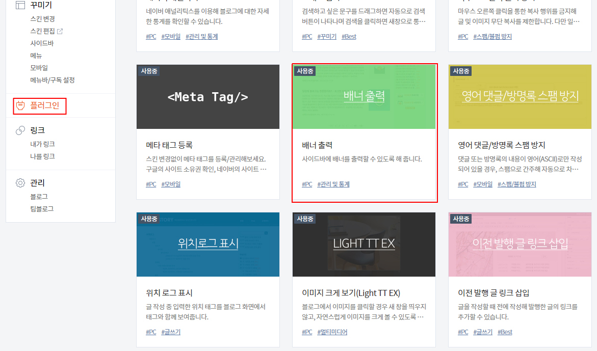 배너 출력을 누르고 적용을 누르시면 이제 이 플러그인을 사용 하실 수 있습니다.