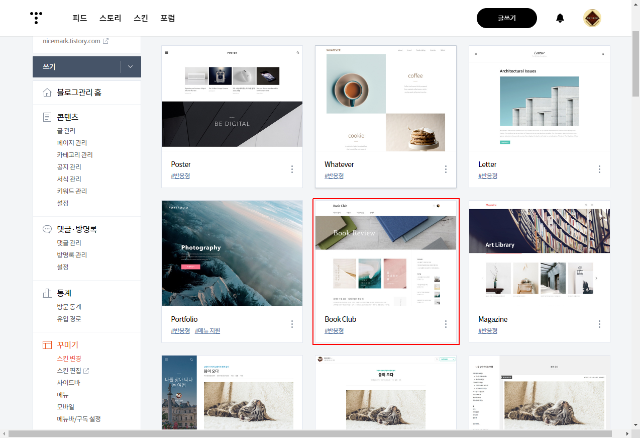 티스토리에서 제작 및 배포 한 'Book Club' 스킨을 사용하였습니다. 깔끔하면서도 반응형을 지원하며, 사이드바가 있어서 저는 이 스킨을 사용하였습니다.