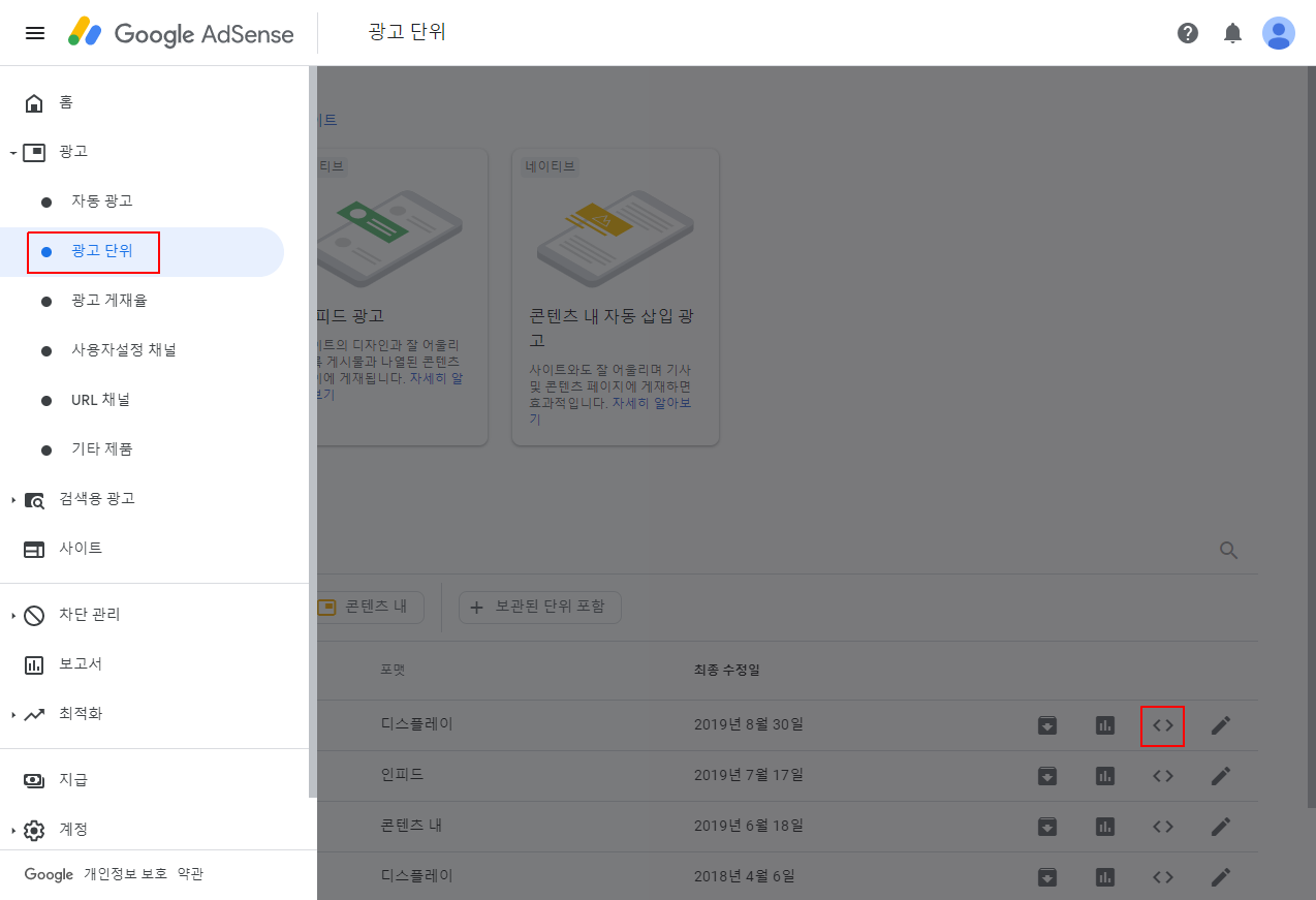 구글 애드센스에 접속 후 '광고단위'를 눌러줍니다.