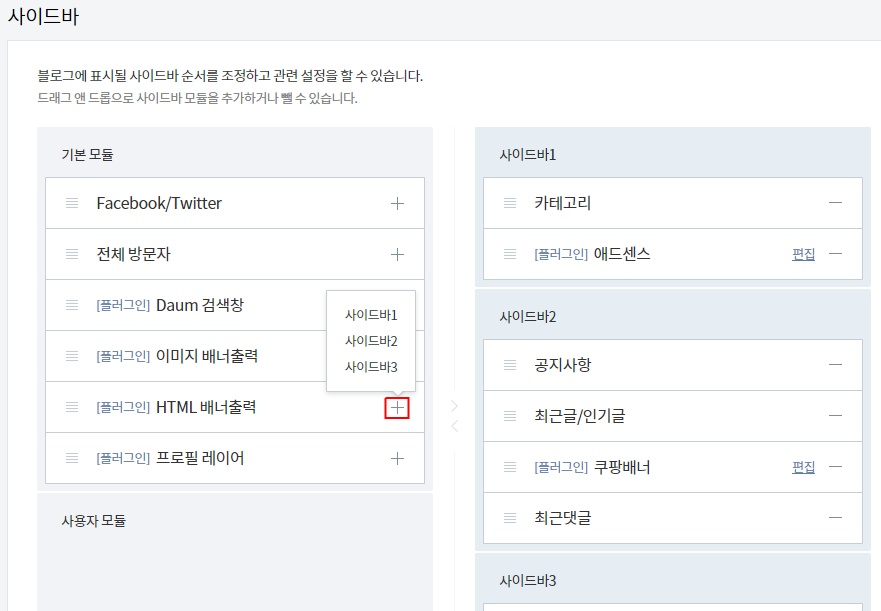사이드바의 어느 위치에 넣을지 선택을 해주시면 됩니다.