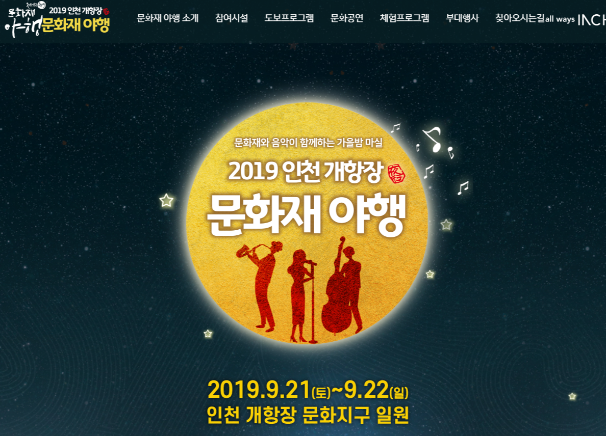 인천개항장에서 펼쳐지는 개항장의 역사성을 간직한 풍부한 문화유산과 주변의 문화 콘텐츠를 활용하여 다양한 역사문화체험의 기회를 제공하고 개항이라는 특색 있는 콘텐츠를 주요 콘셉으로 야간에만 즐길 수 있는 새로운 문화경험제공. [출연진: 김완선, 아디오스 오디오 / 일시: 2019. 9. 7(토) ~ 9. 8(일)]