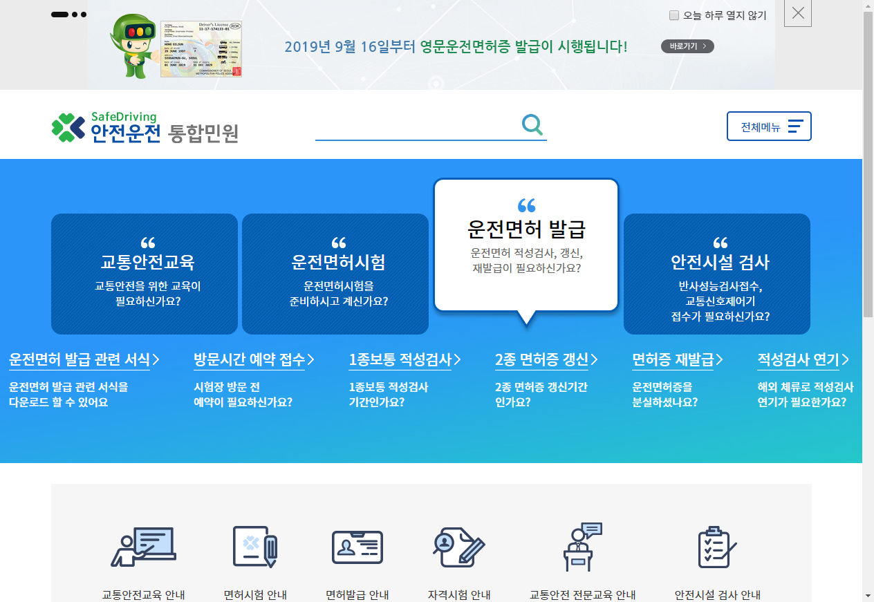 도로교통공단의 통합민원 서비스로 안전, 교육, 운전면허 정보와 민원을 PC 및 모바일로 제공하는 대표 포털
