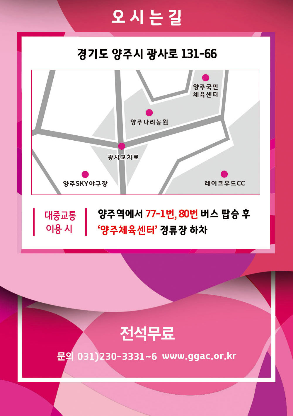 대중교통 이용 시 : 양주역에서 77-1번, 80번 버스 탑승 후 '양주체육센터' 정류장 하차